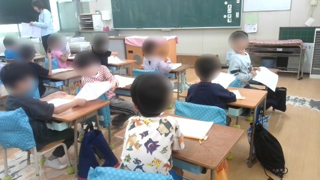 学活で、プリントや宿題の配布などをしていました。プリントしまい方や宿題の進め方などについて、以前に指導されたことを確認しながら進めていました。