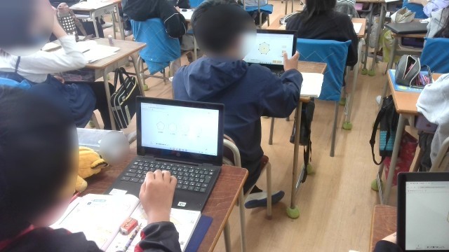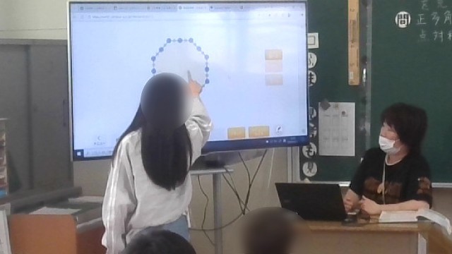 算数の学習です。線対称の学習で、タブレットの機能を使って図形を動かしながら線対称かどうかや対称の軸がどれかなどを確認していました。図を動かしながら確認できるのでとても分かりやすいです。