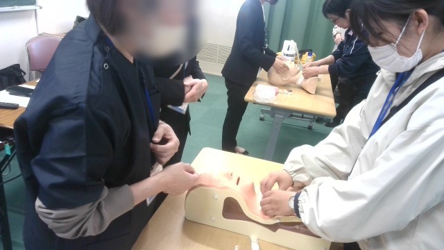 教育委員会から看護師さんにきていただいて、教職員ができる児童への医療的ケアの実技研修でした。ビデオ動画を視聴したあと、モデルを使って一人ひとり実技研修をしました。万が一を想定して教職員がそれぞれが備えておくことが大切だと考えています。
