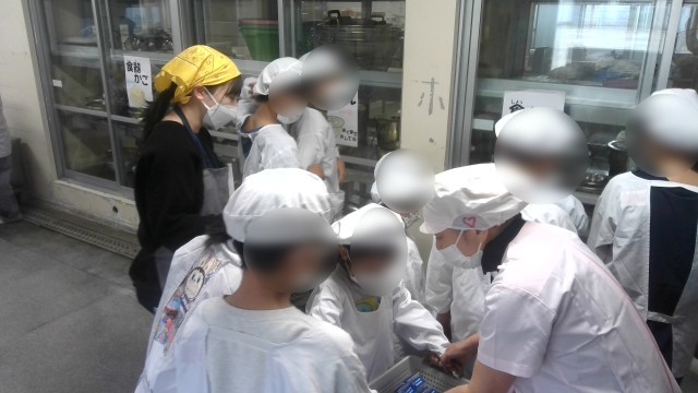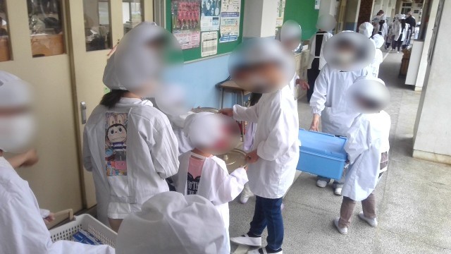 1年生も6年生のお兄さんお姉さんたちに手伝ってもらいながら食器やおかずなどを給食室から教室まで頑張って運んでいます。