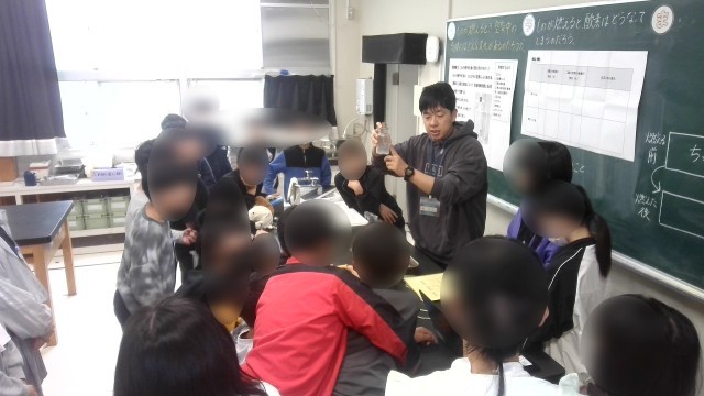 理科の学習でした。「物が燃えると、酸素はどうなってしまうのだろう」という問題に取り組んでいました。班で話し合ったことを発表しあい、全体で予想を立てました。先生の例示実験で手順や注意点などを確認した後、瓶の中でろうそくをに火をつけ、火をつける前と後の瓶内の気体の変化を調べる実験をしていました。