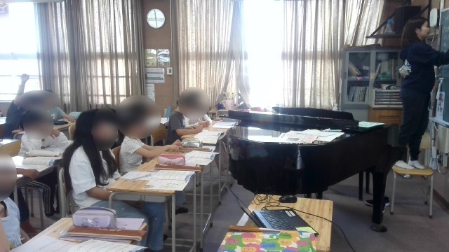 音楽の楽手です。「こいのぼり」の歌を聞いて感想を発表しあっていました。歌詞から思い浮かぶ情景についてや曲全体が元気よく聞こえたこと、歯切れのいい曲調であるなどの感想が出ていました。
