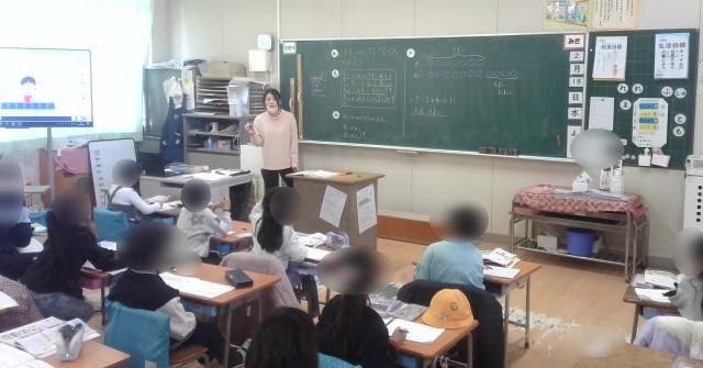 1年生の様子です。 算数の学習です。「4人の子どもがいすにすわっています。いす...