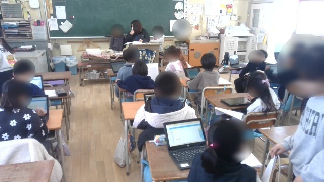 5年生の様子です。 英語の学習です。モニタの動画を観ながら教科書の問題に答えて...