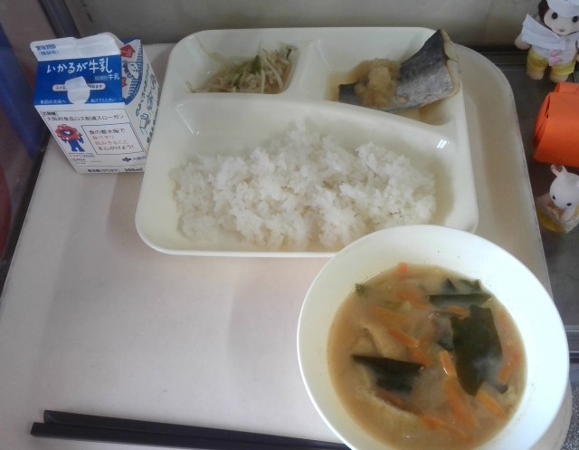 今日の献立は、さごしのおろし醤油かけ、味噌汁、もやしとピーマンの炒め物、ご飯、牛...