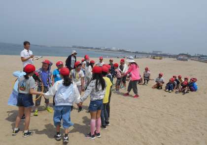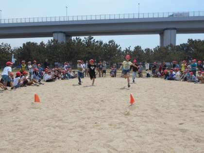 午前中は、浜辺で、4クラス対抗のミニ運動会をしました。種目は、〇×クイズ・フラフープリレー・飛行機とばし・ビーチフラッグの4種目をしました。その後は、波打ち際で、波とたわむれたり貝殻を拾ったりして遊びました。