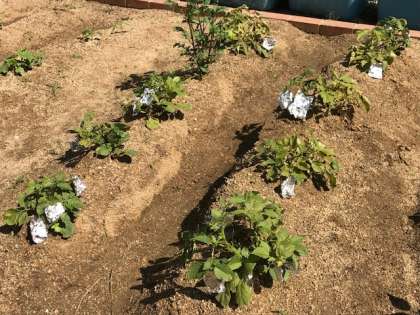 6年生の学習園ではジャガイモを育てています。今は、葉にアルミホイルを巻いて、理科の実験中です。