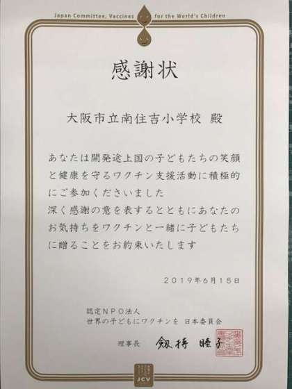 エコピカ委員会を中心に「ペットボトルキャップを回収してワクチンを送ろう」と全校で取り組んでいる活動に対してNPO法人「世界の子どもにワクチンを 日本委員会」より感謝状をいただきました。