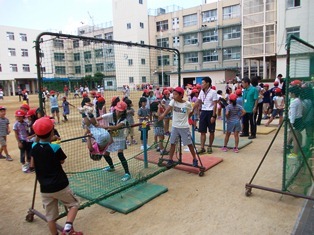 休み時間を使って、鉄棒練習会が開かれました。たくさんの児童が参加し、逆上がりができるようになりました。