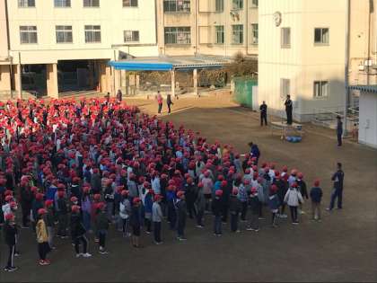 今日は、校舎の改修工事が始まって以来、久しぶりに運動場で児童朝会を行いました。少し冷え込みが厳しかったものの、全学年の児童が運動場に集合して校長先生や係の先生の話を聴きました。