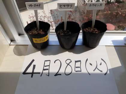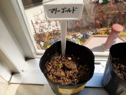 種をまいたマリーゴールド、ヒマワリ、ホウセンカのうち、早くもマリーゴールドから芽が出ました‼小さな双葉の葉がひょっこり顔を出していますね。すくすくと育つようにたくさん水をあげてます。