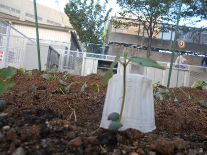 3まいめの しゃしんは、エダマメの なえの 大きさを、白いポットの 大きさと くらべてみました。