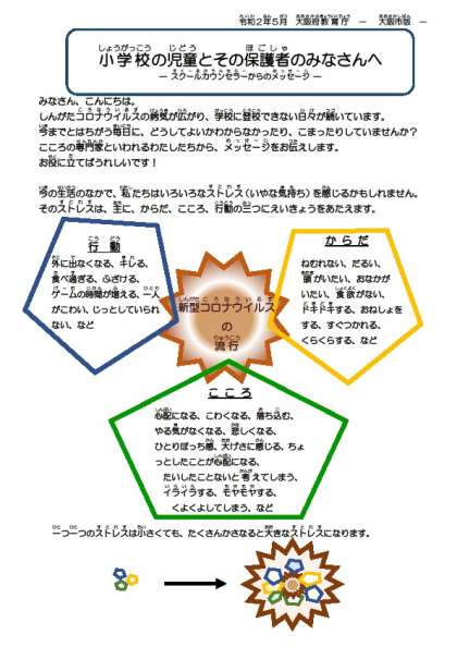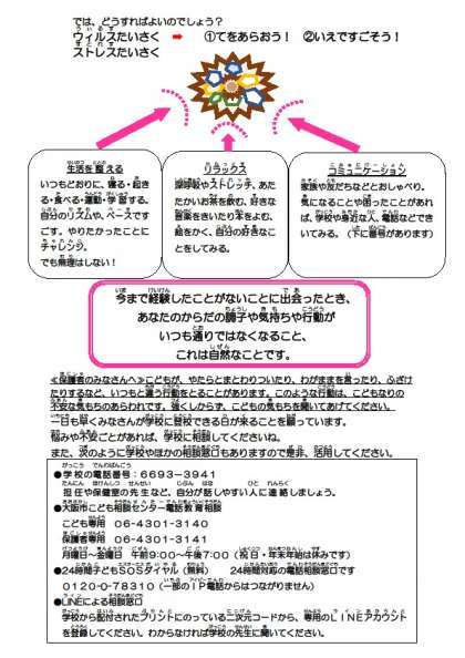 大阪市教育委員会より、「新型コロナウイルス感染症のまん延に伴い、府内全域の学校では、臨時休業措置となり、家庭及び児童生徒の日常生活が大きく変わる事態となりました。世界全体が不安にさらされる中、子どもたちの心や体にも影響が出ていると考えられることから、スクールカウンセラーから子どもたちに向けてのメッセージが届きました。」との連絡がありましたのでお知らせします。