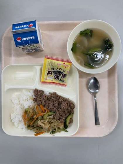今日の給食は「ビビンバとトック、煎り黒豆」です。