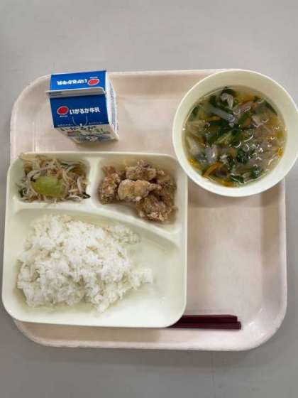 今日の給食は「鶏肉のから揚げと中華スープ、チンゲン菜ともやしの甘酢あえ」です。