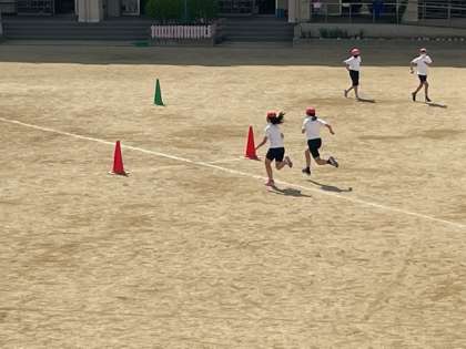 5年生、6年生は体育の授業で短距離走に取り組んでいます。スタートの感覚づくりを行ったり、中間を通過するタイムを測ったりと工夫を凝らした授業となっています。