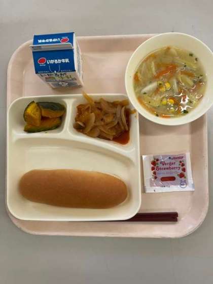 今日の給食は「煮込みハンバーグとコーンスープ、焼きかぼちゃ」です。