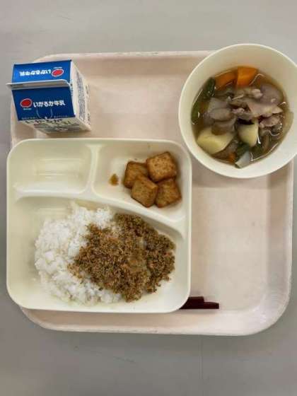 今日の給食は「鶏肉とじゃがいもの煮物と厚揚げの醤油だれがけ、紅鮭そぼろ」です。