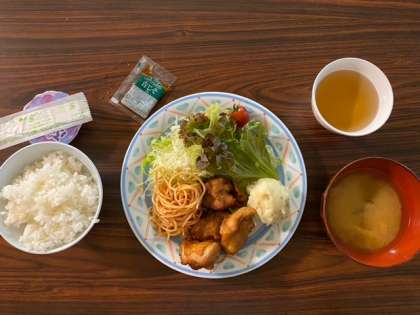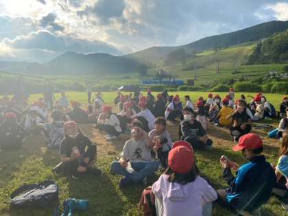 オリエンテーリングの後、りんごジュースを飲んでひと休み。宿舎に帰って夕食の時間です。たくさん動き回った後なので、食欲ももりもりだと思います。