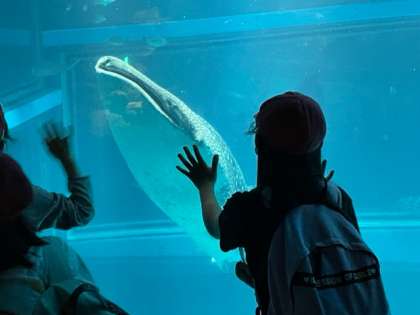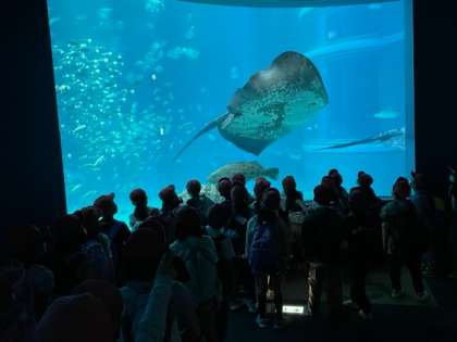 小雨降る中の出発となりましたが、大阪港駅に着いた頃には雨も上がりました。海遊館は、ほかの学校もたくさん来ており、ゆっくりと鑑賞できませんでしたが、イルカやアザラシ、大水槽のジンベエザメやマンタなど、子どもたちは時折マスク越しに歓声を上げながら、興味津々でした。