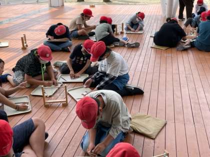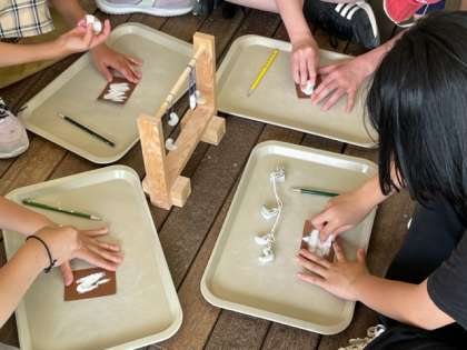 昼食後は、場所を入れ替えての活動です。「弥生学習館」では、ろう石を使って勾玉づくりを行いました。Ⅼ字型の石に型取りをし、紙やすりで角を取って丸みをつけていきます。丸みが付いたら、水ペーパーをかけて磨いていきます。もとは同じ形でしたが、できあがった作品は、個性豊かなものとなりました。