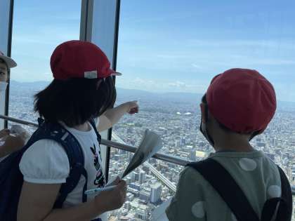 3年生が、あべのハルカス展望台から景色を見た時の声でした。社会科で大阪市について学習しますが、この社会見学では各グループごとに東西南北から見えるものを確認しながらワークシートに記録していきました。西側には、5月に遠足で行った海遊館も見つけることができ、楽しそうに活動できました。