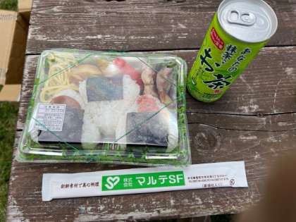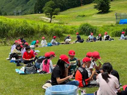 昼食はおにぎり弁当です。少し物足りない人もいるかもしれませんが、屋外で食べるご飯はきっとおいしいと思います。写真では分かりにくいですが、学年全体で大きな輪になって食べています。