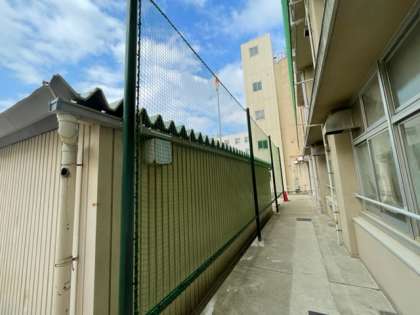 管理作業員さんの合同作業により、家庭科室と体育倉庫の間にある防球ネットがきれいになりました。写真ではうまくお伝えできませんが、支柱はペンキを塗り直し、ネットは新しいものを張ってくださいました。暑い中の作業、ありがとうございました。