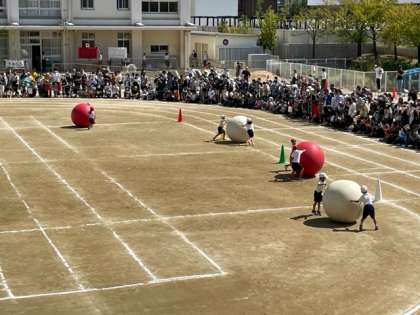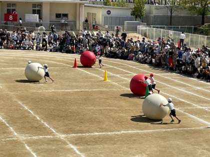 2年生の種目は「ゴールをめざせ!」(かけっこ)と「力を合わせて」(大玉運び)でした。かけっこでは、初めてカーブのあるコースを走りましたが、みんな上手に走ることができていました。大玉転がしでは、2人で力を合わせて背丈ほどもある大玉を転がしました。ちょっとスピードを出しすぎると跳ねたり、思わぬ方へ転がったりと、苦労する場面も見られました。