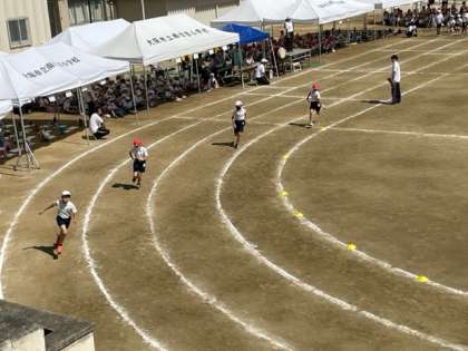 4年生の種目は「スーパーハリケーン」(台風の目)と「スタートの合図で走り出せ!」(かけっこ)でした。台風の目では、4人で力を合わせてコーンを回りながら、棒をリレーしていきます。コーンに近い人をどれだけ上手に回すことができるかが、速く回るコツです。かけっこは、3年生のときと比べて距離が長くなり、ぎりぎりまで競り合う姿が見られました。