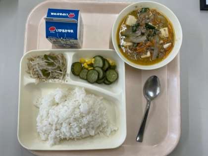 今日から給食が始まりました。1年生にとっては小学校でのはじめての給食です。メニューは「マーボー豆腐・きゅうりとコーンの甘酢和え・もやしとピーマンのごま炒め」でした。準備は、6年生のお兄さん・お姉さんにも手伝ってもらいました。食べ始めると、おかずを増やす子どももたくさんいてびっくりしました。何人かに感想を聞くと「おいしい」といってくれたので安心しました。これからも、しっかり食べてくださいね。