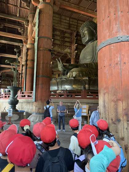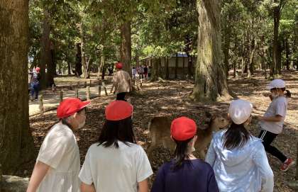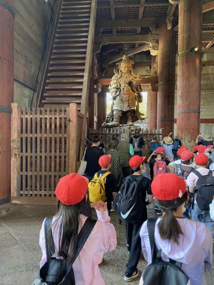 5年生は少し足を伸ばして「奈良公園・大仏殿」へ行ってきました。子どもたちは、大仏の大きさに驚き、こんな大きなものを作った奈良時代の人々の苦労に思いを馳せていました。また、間近で見る鹿にも興味津々の様子でした。遠くまで出かけたこともあり、帰りの電車では疲れた様子だったそうです。