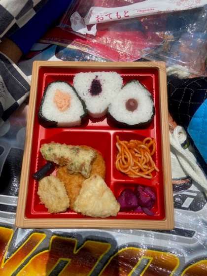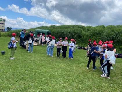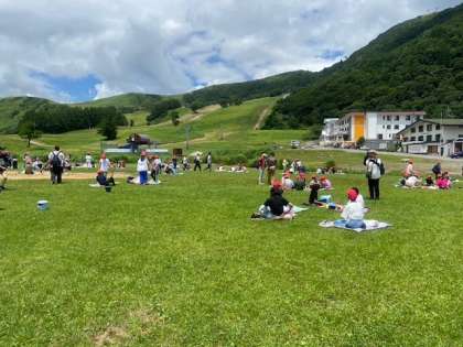 宿舎前の広場で昼食です。宿舎の方からお弁当を受け取り、広い芝生の上にシートを敷いて、楽しそうに食べています。