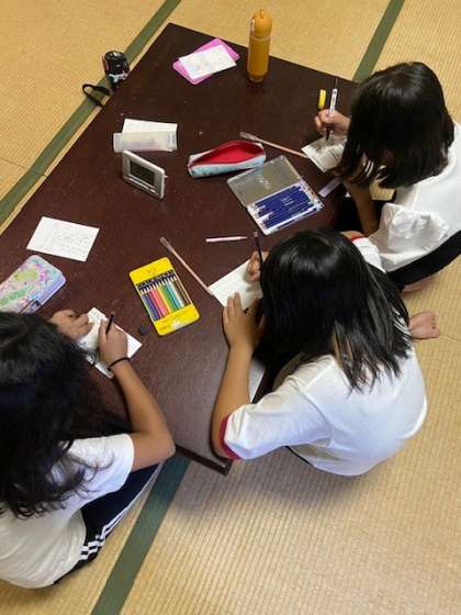 魚つかみが終わり、夕食までの間、部屋でゆっくりと過ごしています。この時間を利用して、ご家庭へのはがきを書いているそうです。どんな内容のはがきが届くのか楽しみにしてお待ち下さい。