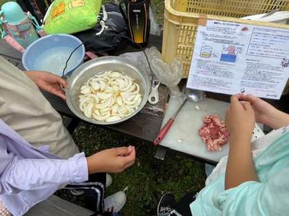 昼食のカレー作りが始まっています。宿舎の人の説明を聞いて、手元のレシピとにらめっこしながら、役割分担にしたがい協力して調理が進んでいます。きっと、おいしいカレーが出来上がることでしょう。