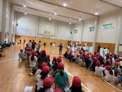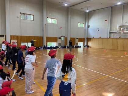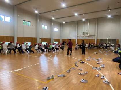 林間学習、最後のプログラム「室内レクリエーション」で、でかパンリレー、紙飛行機飛ばし、スプーンリレー、綱引きを行いました。どの競技も盛り上がりましたが、綱引きでは、子どもたちだけでなく、先生たちも本気で挑み、さらに盛り上がったそうです。とくに決勝戦では、足が滑らないように靴下を脱ぐなど、気合も十分だったようです。