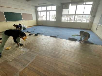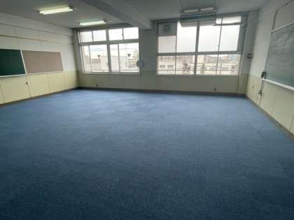 管理作業員さんの合同作業で、日ごろ主に生涯学習の活動に利用している生活科室のタイルカーペットを張り替えていただきました。新しいカーペットは足ざわりも気持ちよく、とてもよい感じに仕上がりました。