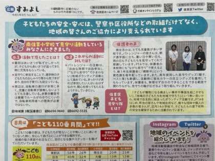 住吉区の広報誌「すみよし」8月号の1面で南住吉パトレンジャーの方々が紹介されました。パトレンジャーさんは、暑い日も寒い日も、また雨の日も、本校の子どもたちの安全のため、登校を見守ってくださっています。2面には、そんなパトレンジャーさんや保護者の方の声も載せられています。ぜひ、手に取ってご覧いただきたいと思います。