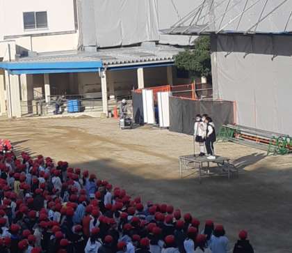 朝会では、健康委員会の児童が、手洗いを励行するように呼びかけました。
