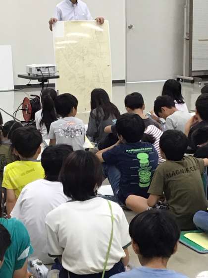 資料館の職員の方が説明してくれています。職員の方のお尋ねにも積極的に答えています。