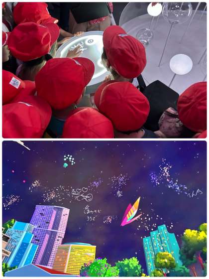 シンガポール館では、「ゆめ・つなぐ・みらい」をテーマに、代表者が自分たちの願い事を心を込めて書き、それを空に届ける演出が行われました。