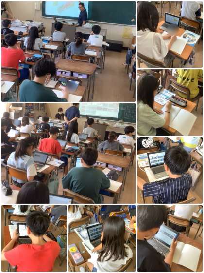 子どもたちは、土砂崩れ・洪水・倒木・停電などの被害を予想し、タブレットを使って過去の台風による被害について調べました。