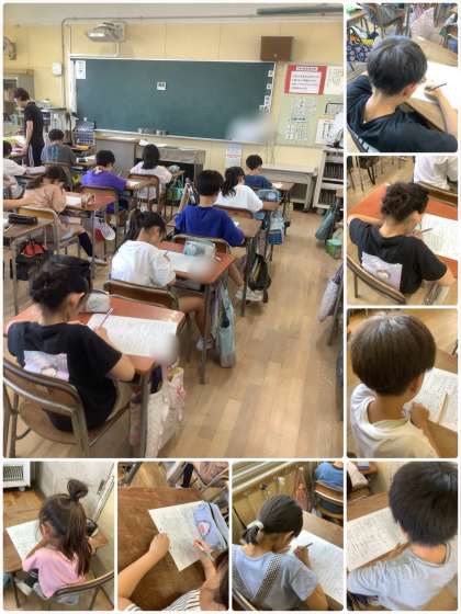 国語のテストに真剣な表情で取り組む3年生。