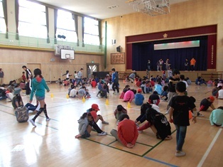縦割り集会がはじまりました。低学年から高学年いろいろな学年の児童が混ざって集会をしています。おにちゃんおねえちゃんにいろいろと教えてもらっています。