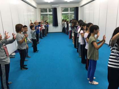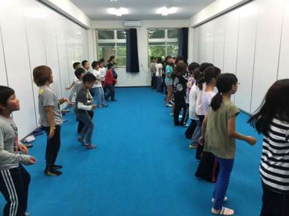 登山の後は、宿舎に戻り、今夜のキャンプファイヤーに向けて、スタンツの練習をしています。