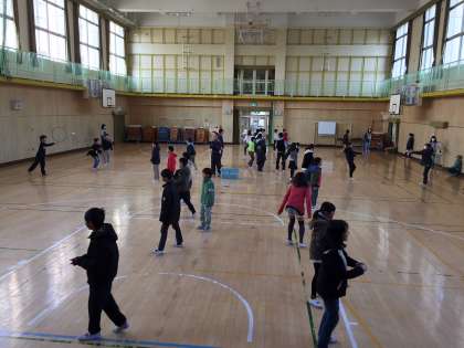 20分休みに体育館に集まってきた約40人の子どもたち。