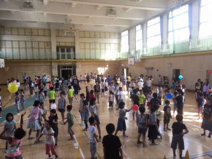 1年生から6年生までみんなで風船遊びをしました。みんなどこまで続くか 数えてみましょう。