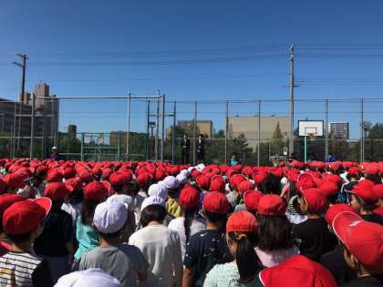 台風の影響で、今週の月曜日は3時間目からの登校になりました。登校後、第2グラウンドで朝会がありました。教育実習生の最後のあいさつがありました。