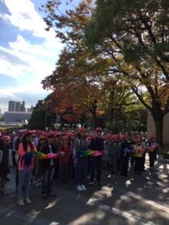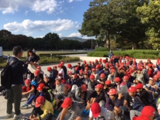 平和記念公園で、全校児童の平和へのメッセージを込めた”千羽鶴”を捧げました。