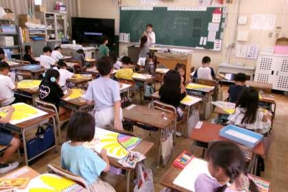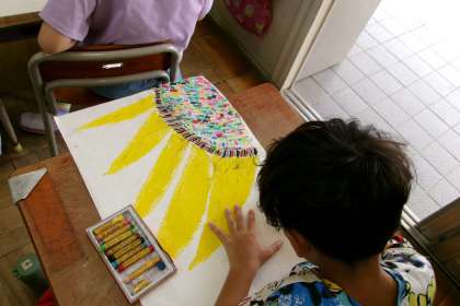 1年生の図工では、夏の花「ひまわり」をテーマに絵を描きました。